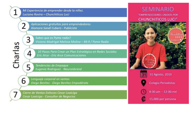 Sí, a los 8 años di mi primera conferencia en un evento de emprendimiento que se llamó Mujeres de 24 kilates. El año anterior me invitaron a ser conferencista en Tedxwomen 2018 hablando de la pobreza infantil y juvenil. Este año me invitaron a la ULACIT a dar una conferencia, en la fecha del Día de la Mujer, porque las mujeres podemos hacer todo lo que nos propongamos. También me invitan a los colegios a dar charlas para motivar a los chicos a emprender y a contar mi testimonio.